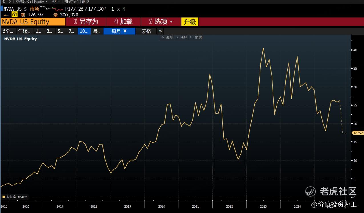 从估值上看,英伟达当前市销率超25倍,属于较高估值,如果能够按照分析师预测,未来2个季度营收保持50%的增长,今年年底的市销率估值将降至17倍,不算太高: