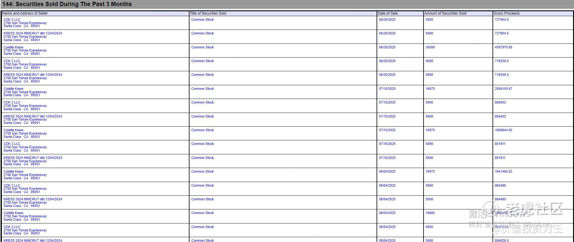 除老黄外,英伟达其他高管近期也在密集减持,如首席财务官Colette Kress在9月19日大笔减持14.58万股,套现2575万美元。