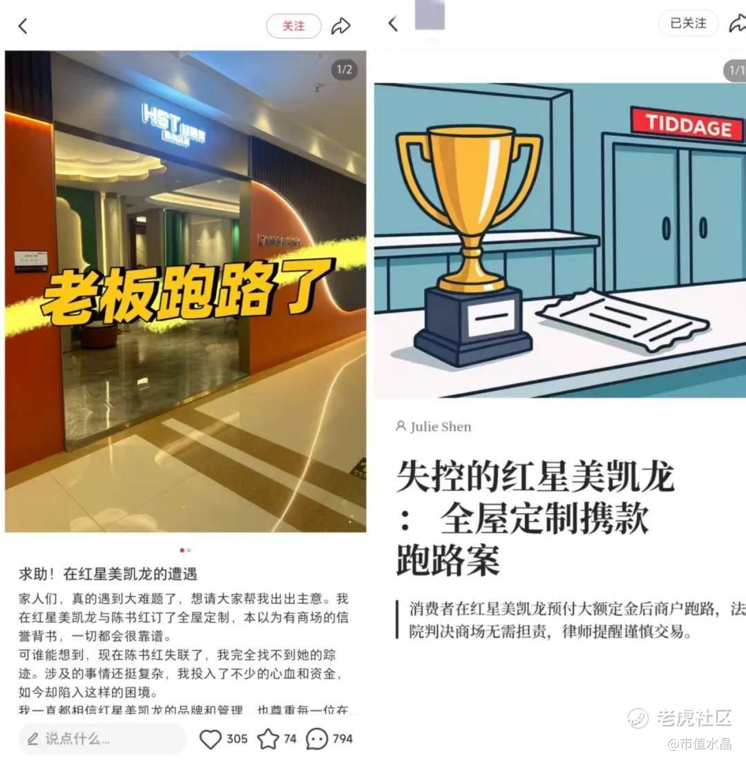 不谈现金流与转型新业态,美凯龙的口碑也急转直下。不少网友在社交平台上表示美凯龙商户在收取订金后“卷钱跑路”,顾客既无法找到商户追回财产,也无法在美凯龙商场处取得售后帮助。