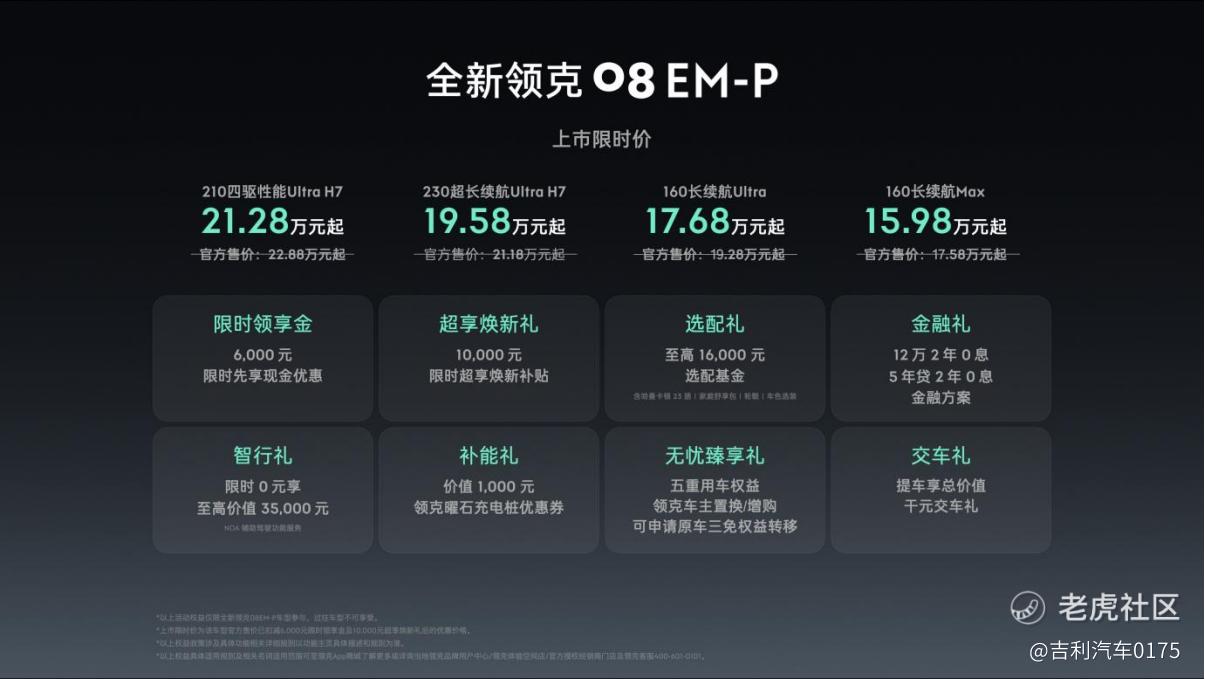 近日,领克两款焕新混动车型接连上市:定位“家庭豪华智混SUV”的全新领克08 EM-P,提供160长续航Max、160长续航Ultra、230超长续航UltraH7、210四驱性能Ultra H7四款配置,官方限时价15.98万元-21.28万元;定位“都市科技智混轿车”的全新领克07 EM-P,推出126长续航Max、126长续航Ultra、126长续航Ultra H7三款配置版本,上市限时价13.98万元起。伴随两款新车上市,均享有8重限时福利。