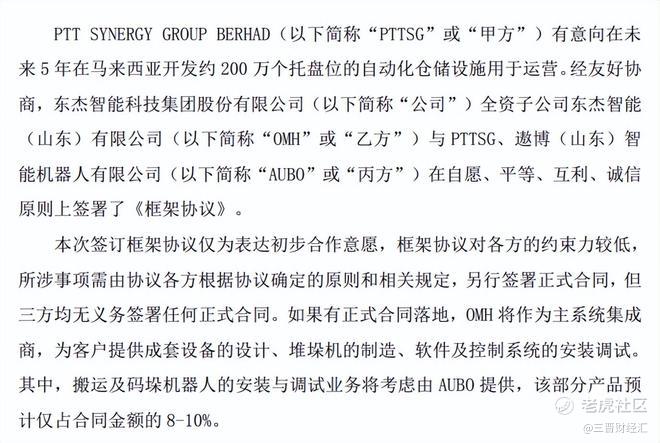 9月25日,山西A股上市公司东杰智能(300486.SZ)发布公告,其全资子公司东杰智能(山东)有限公司与马来西亚PTT SYNERGY GROUP BERHAD(以下简称“PTTSG”)、遨博(山东)智能机器人有限公司共同签订框架协议。
