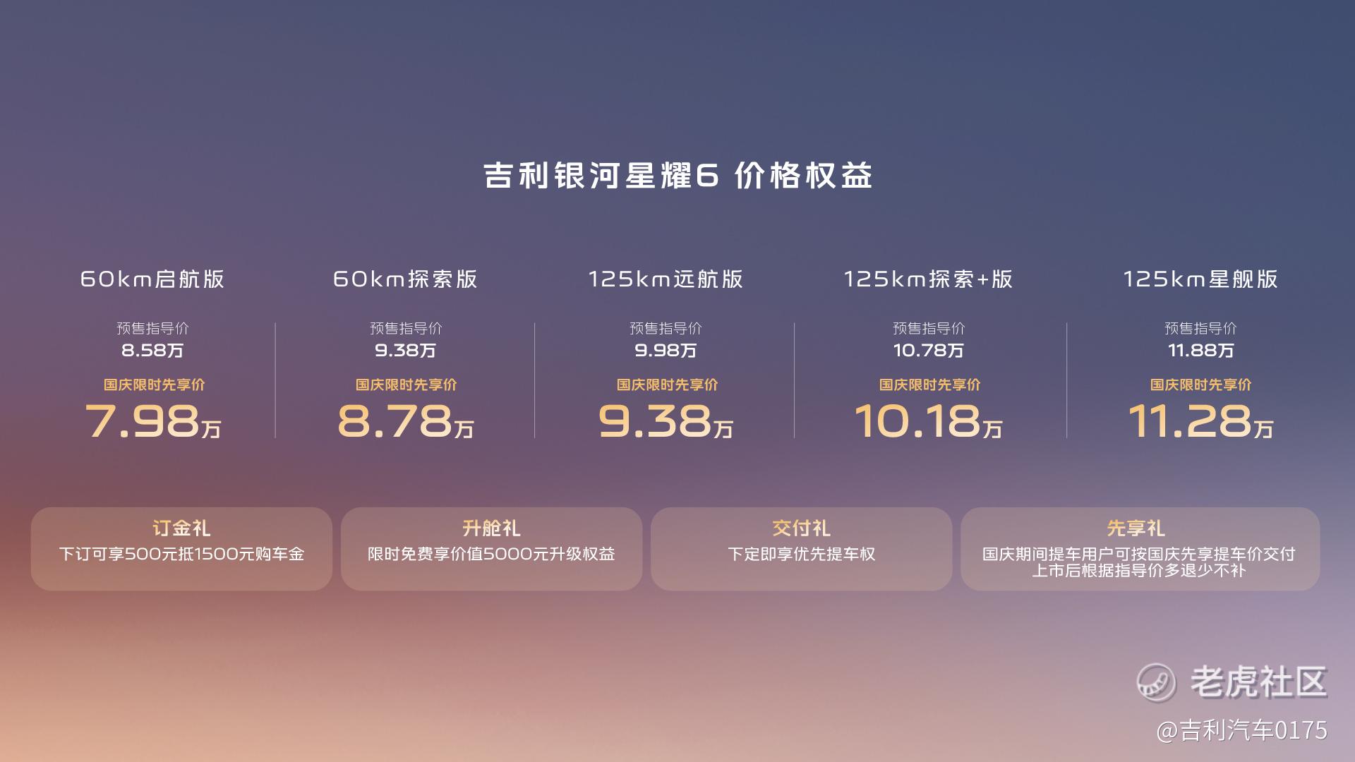 凡在预售期下订吉利银河星耀 6 的用户,均可享 500 元抵 1500 元购车金、限时免费享价值 5000 元配置升级、优先提车权等丰厚权益。考虑到国庆假期将至,为满足用户早日提车出游的心愿,吉利银河星耀6特别推出“国庆先享权益”:即日起至国庆前成功下订,即可尊享国庆先享提车价7.98万元起,并享受国庆前优先提车权益。据悉,吉利银河星耀6将于10月正式上市。