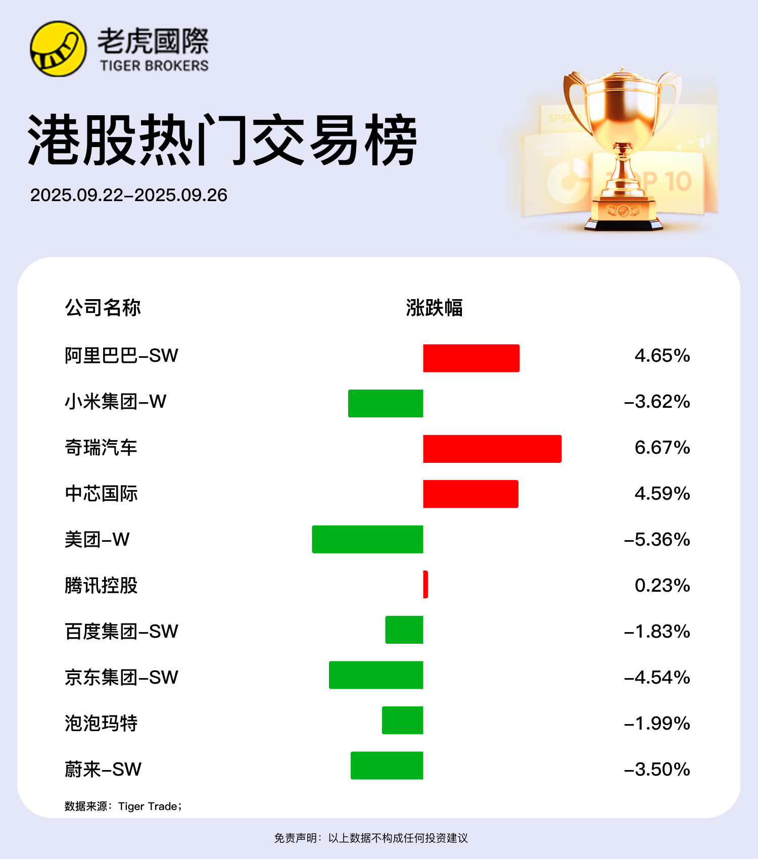 Top1:阿里巴巴,本周,2025云栖大会召开,阿里巴巴宣布积极推进3800亿的AI基础设施建设,并计划追加更大的投入;同时宣布与英伟达开展Physical AI合作;带动股价大涨,互联网板块受提振; $阿里巴巴-W(09988)$
