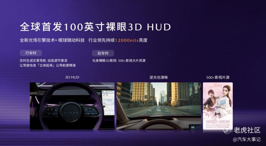 EZ-60全球首发100英寸裸眼3D HUD,将车载HUD视觉技术推向全新高度。SLHM空间算法+导航让信息呈现出“分层景深”,最大限度消除视觉延迟,避免潜在的分心事故。眼位追踪功能让画面和眼球随动,解决了HUD“飘、抖、晃”的技术痛点。此外,3D-HUD还能化身裸眼3D影院,线上影视库提供超过500部3D片源。
