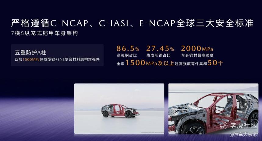 安全是马自达刻在骨子里的DNA,EZ-60通过实战测试+权威认证双维度,树立了新能源中型SUV安全领域的新标杆。卓越的碰撞成绩来自于车身结构的创新。EZ-60采用7横5纵的笼式铠甲结构,高强钢占比86.5%,热成形钢27.45%,最高强度2000MPa,全车1500MPa及以上超高强度零件集群50个,关键部位更是层层加码。