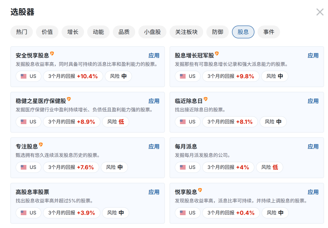 不过,寻找最佳股息股还有其他途径,例如Investing.com选股器提供的8种专业预设股息筛选模式:
