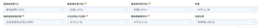 为识别当前最佳的股息股机会,我们借助Investing.com选股器,寻找符合以下标准的股票: