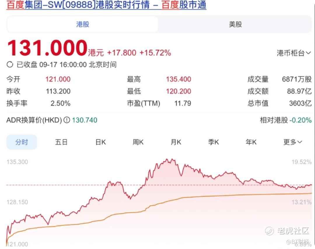 9月17日,百度港股股价大爆发,盘中股价一度涨超19%,最终报收16%的增幅创下年内新高。截至2025年9月18日港股收盘,百度股价为132.8港元,最新市值3652亿港元。百度美股同期也大涨近8%,收盘价124美元,创2023年10月以来新高,市值来到426亿美元。