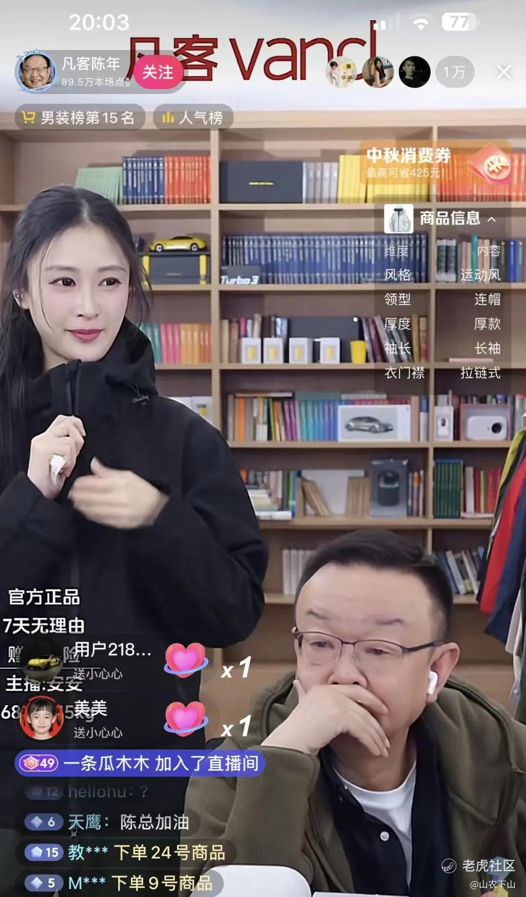 9月26日晚上11点50分,陈年在“凡客陈年”的抖音直播间里念叨着。这场直播点赞已经超过1000万,位居男装榜第2名。