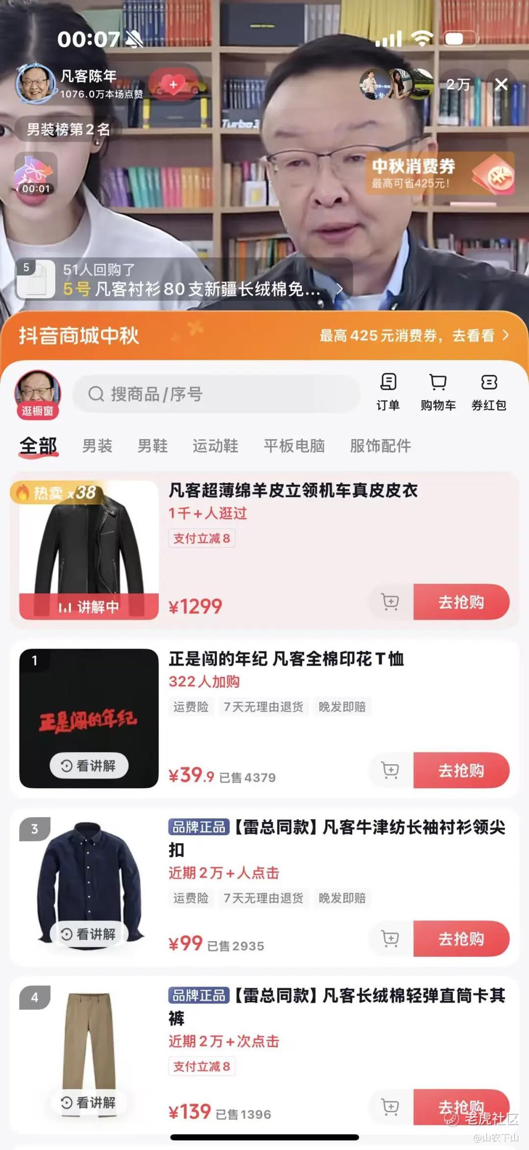 雷军在9月25日的年度演讲中提到了这个故事。很多人冲进凡客直播间下单,顺便见到了这位老板主播潸然掩面的一幕,直接把凡客陈年直播间冲到了抖音男装榜第一。这个与小米公司业务关系不大的环节,成为整场演讲讨论度最高的话题——