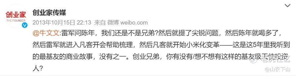 雷军与陈年各自的创业故事都有“爽文”的影子,CP线更是如此。时任《创业家》杂志社社长的牛文文在2013年10月发过微博:
