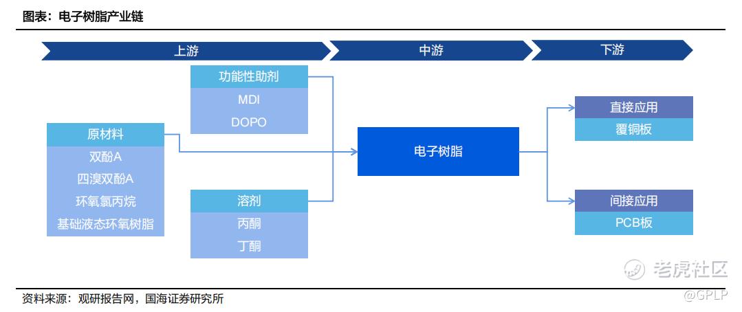 电子树脂行业产业链上游行业为主要原材料,包括双酚A、四溴双酚A、环氧氯丙烷、基础液态环氧树脂等,功能性助剂包括MDI、DOPO等,溶剂包括丙酮及丁酮等。产业链中游聚焦电子树脂生产制造。产业链下游是覆铜板行业,间接应用于PCB行业,终端应用于计算机、消费电子、汽车电子、通讯设备等领域。