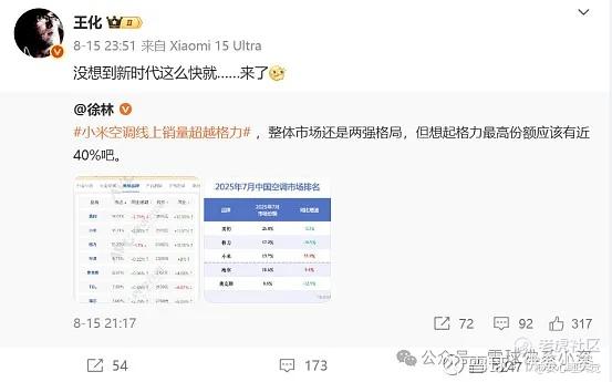 相关网络截图内容显示,小米空调线上销量超越力,相关内容获小米集团公关部王化转发并评论称,“没想到新时代这么快就来了”。