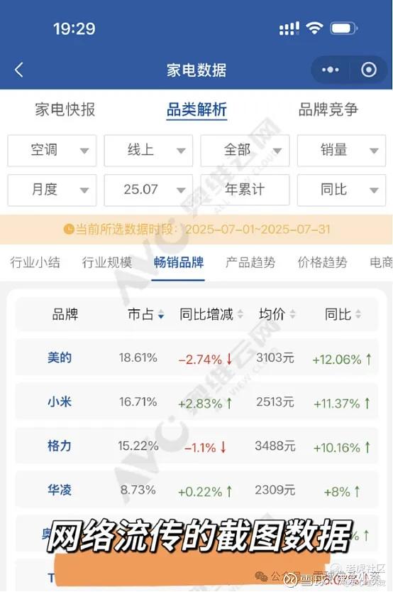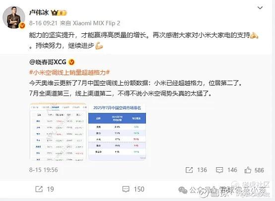 此前,相关网络截图内容显示,小米空调7月线上销量超越格力。相关内容获小米集团公关部王化、小米集团合伙人、总裁卢伟冰等人转发并评论。