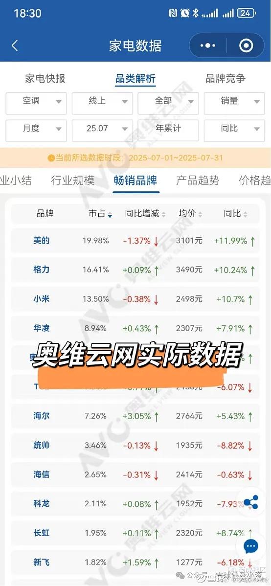 朱磊称:“最近看到有网友转发几张关于空调销量的截图,由此引发的话题‘小米空调线上销量超越格力’大家讨论得很热烈。感谢大家对行业的关注。我们也去奥维云网查了下,公开的数据和那几张截图并不一样。按照同样的查询条件,7月线上市场格力仍然保持领先。”