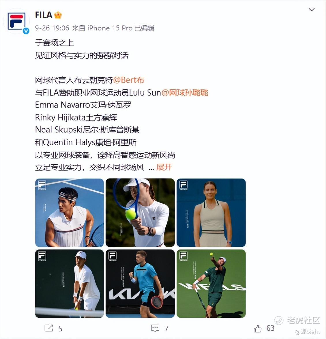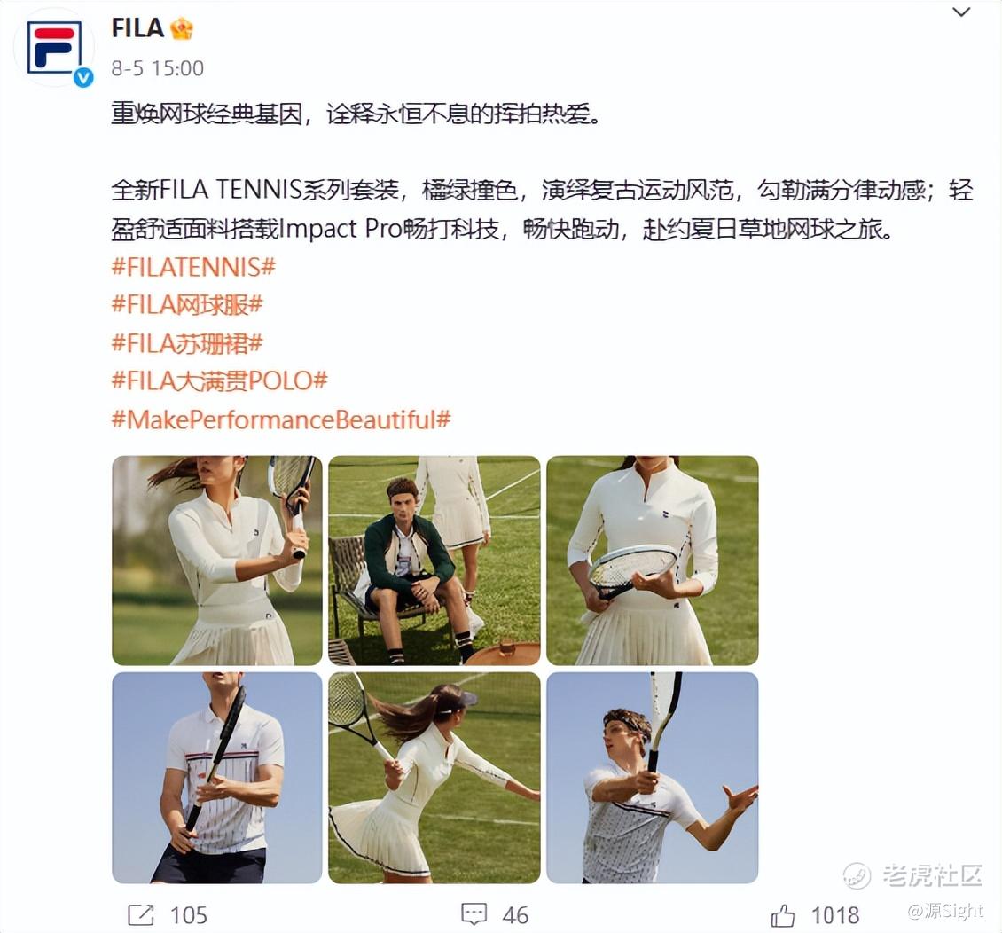 起源于贵族运动的网球,一直有着高端、时尚的属性,这与FILA主推的运动时尚风相契合。而FILA通过与网球的绑定,也奠定了其在该领域的基调。