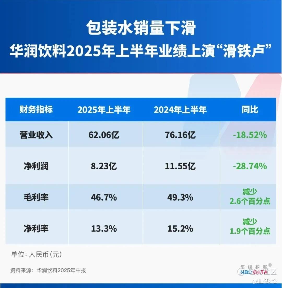 怡宝主导的包装饮用水业务,始终是华润饮料营收的“压舱石”,但在近期披露的2025年半年报中却成了拖累业绩的关键,公司营收、净利双双下滑。上半年华润饮料包装饮用水营收同比下跌 23.1%,且细分产品全线遇冷——小规格(1升以下)、中大规格及桶装水无一例外出现营收下滑,其中小规格产品下滑幅度最为显著,达26.2%,成为拉低整体包装水业务营收的主要因素。华润饮料坦言,包装水产品销量减少。