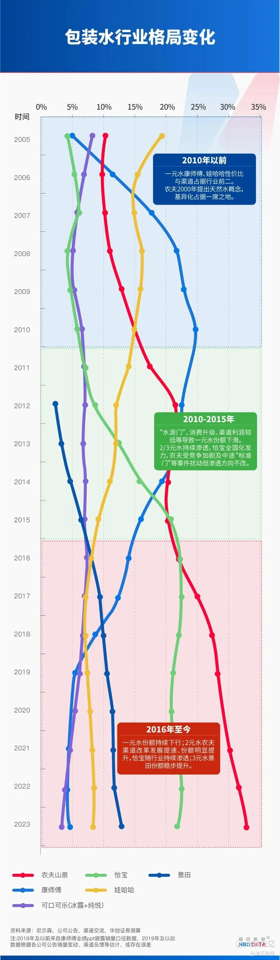 凭借渠道铁军和区域深耕成为华南霸主,2015年怡宝反超农夫山泉登顶行业第一。
