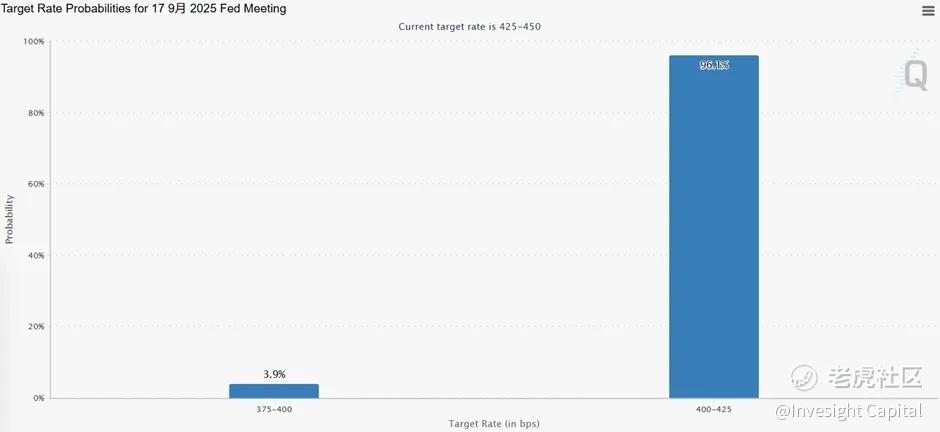 当前市场对9月FOMC会议降息几乎形成一致预期,联邦基金利率期货显示降息25个基点的概率高达96%,几乎已成定局。然而,本轮政策宽松并非源于通胀已回落至理想水平,而是由于就业市场出现断崖式疲软。8月非农就业新增仅22K,远低于市场预期的75K,创下近年新低,且前几个月就业数据已呈现逐步下滑趋势。