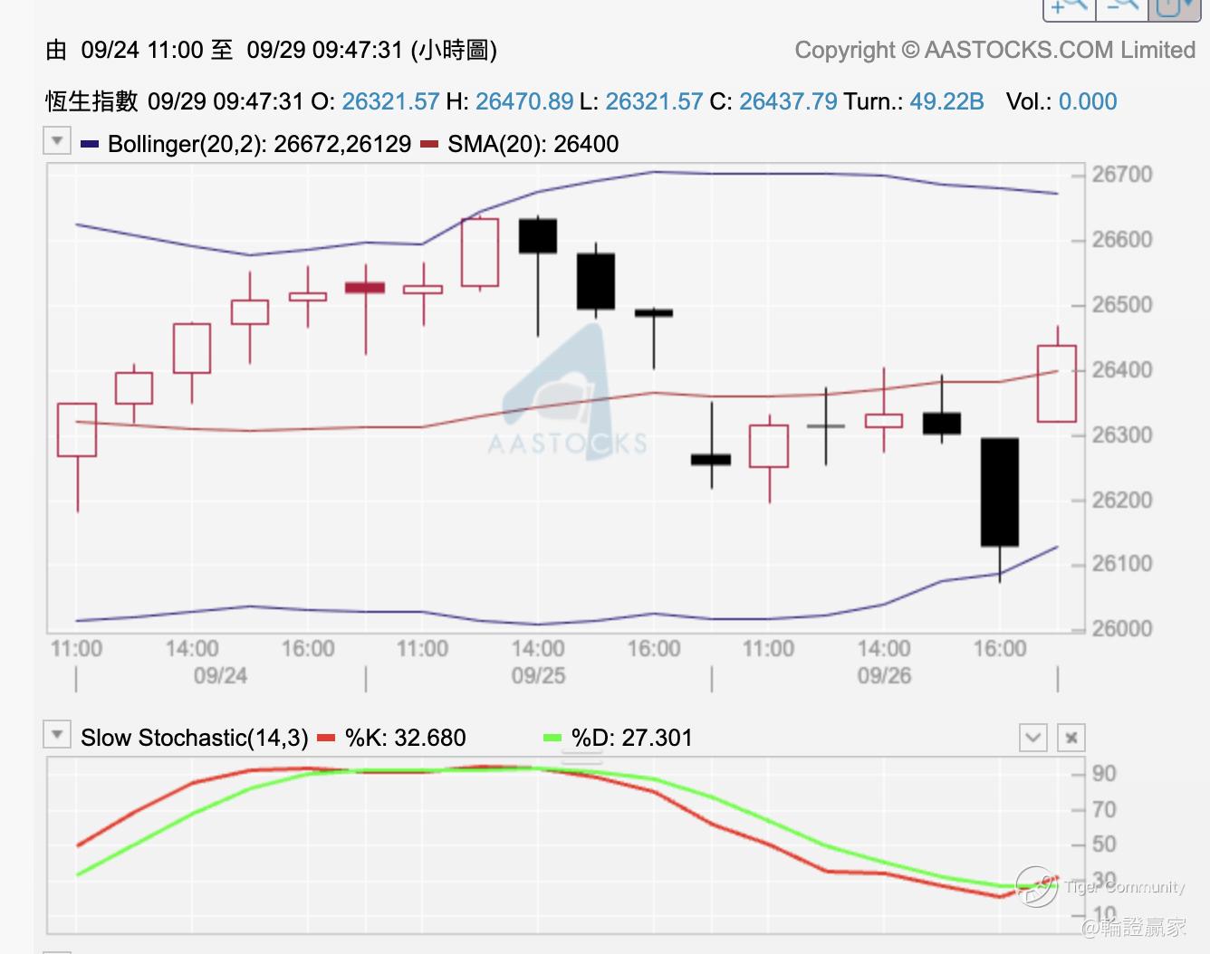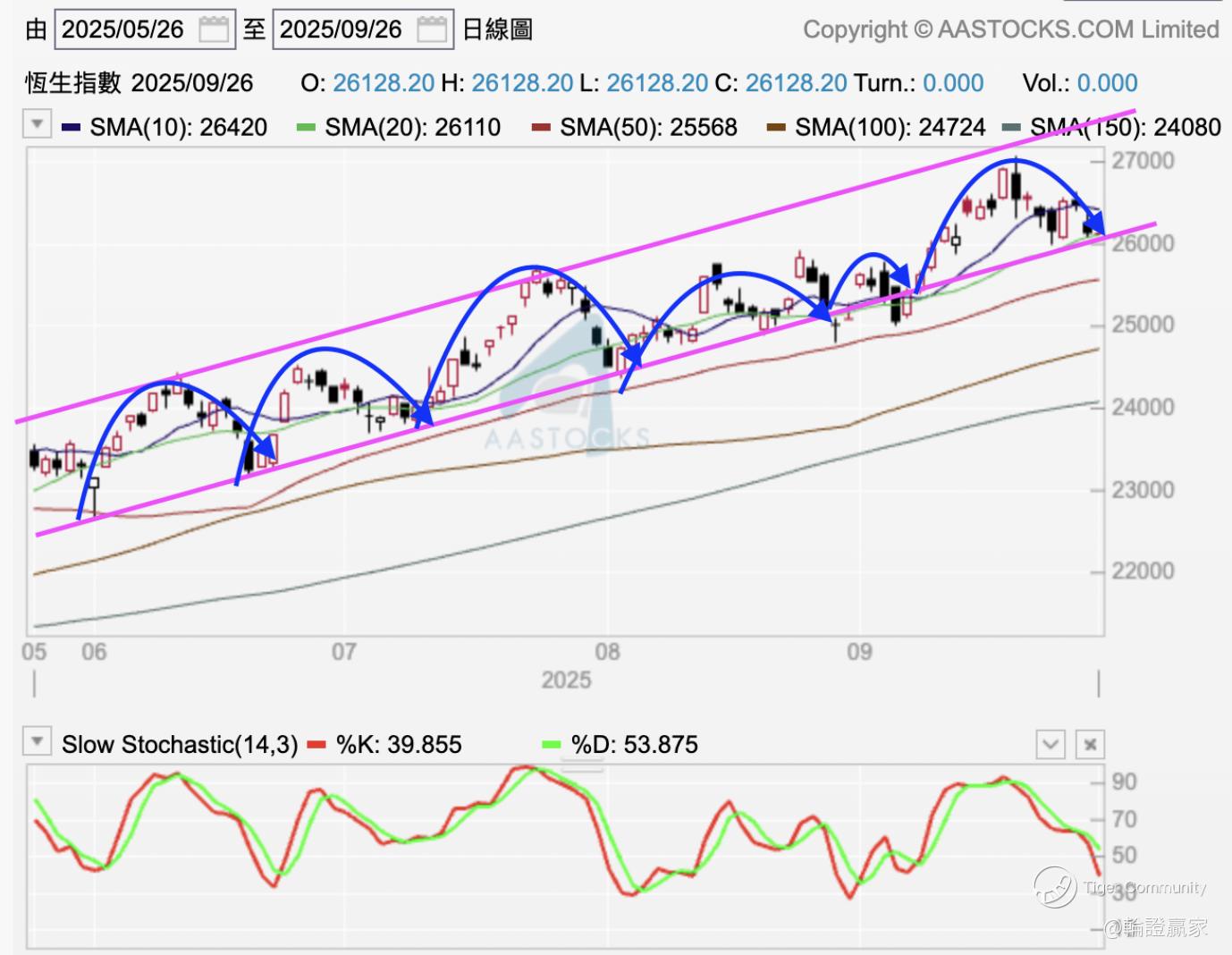 指数呢一落,就落到去小时图保历加底、日线图20线前,同「上升通道」底线,如果指数喺日线图借「上升通道」轨迹并以一浪高于一浪嘅形态向上嘅话,咁今日就要好好地Mark住呢几个位置。