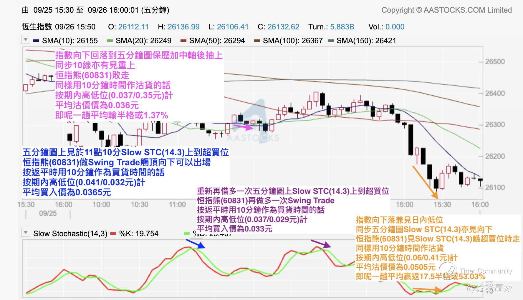 再昼少少喺1点50分见五分钟图Slow STC(14.3)上到超买位,恒指熊(60831)再出多次做Swing嘅话,踩入3点之后已经见返五分钟图Slow STC(14.3)落到超卖位,呢一注强呀,将之前嗰一注输嘅完完全全Cover返有凸。