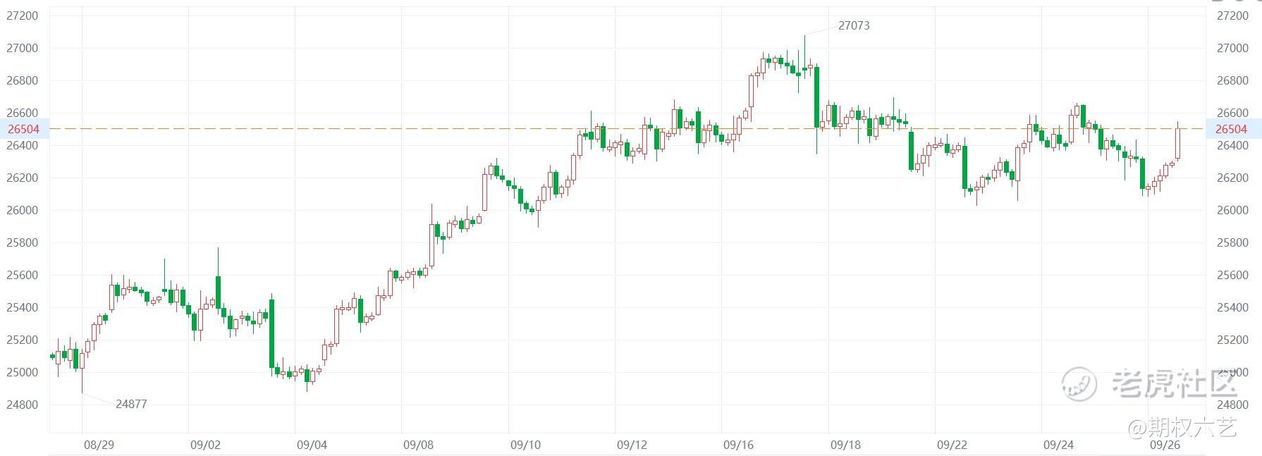 今日9月指数衍生品结算日,恒指9月波幅24,877 - 27,073近2200点,三周27000-26000间波动,实则除一日外仅700点波幅着实低波动。高位横行不免给人放货之疑,万亿北水转身亦难,港股几年高位小心待之,踊跃买盘难现撒手即跌几百点。27000之上不做判研,多年未见以无印象。26000/25800为支撑,破位好仓小心离场,高位认购期权做足对冲,即使横行也可周周收入,买认沽无大挫难现效果,时间值磨损。十一内地假期港股常有独舞,与内地股市联动恒指渐无活力,本周三及下周一假期,波动快起来。恒指期权周双买上周一月期权入场,比之周期权多一日,时间换空间名言体现,多一日胜负之差同为9月恒指标的。周五午后跌落至26100,周期权上午以定价午后停滞月期权照常,认沽已微调至26000put尾市离场,十点内轻微收获算做平手。结算前日平仓是常态,到结算日是交易狠人或用利润去奔跑所为。近五周四周是微调期权得力,仅一周教科书式双买勒束起效。理论于实际中难以完胜,不具微调能力双买不能持续是定律。下半年连续14周1失利1平,现今低成本才持久,恒指无趋势无可判研,成本低不惧磨损且拿的住等得起机会出现—心中不慌。恒指期权以有难度,成交量亦可看出,不是缺乏“专业散户”,是他们看出进场值博率低。 $恒生指数主连 2510(HSImain)$ $HSI(HSI)$ $00700(00700)$