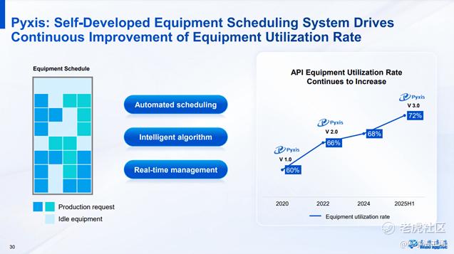 比如,设备智能调度程序能够实时自动安排好40个车间、800多台反应釜、全年超过3万批次的反应,确保根据不同的生产需求,给出最优的排列组合,像“俄罗斯方块”一样,留下最少的“空隙”,车间整体使用率从2020年的60%提升至如今的72%,相当于在40个车间之外新建了8个车间。考虑到设备常规维护、技改等,72%已经接近行业天花板。