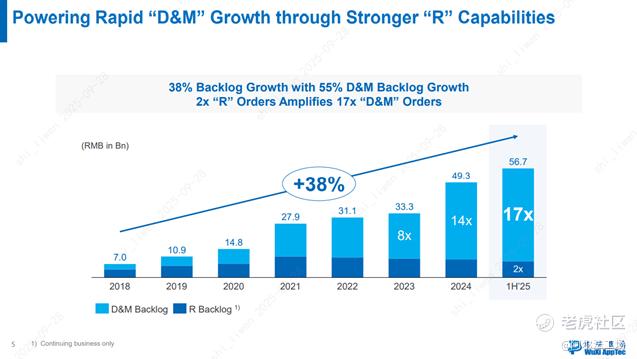 公司财务表现上的一组亮眼数据,正是对此的极佳注脚:2025年上半年,药明康德的持续经营业务在手订单首次突破500亿。自2018年起,药明康德的持续经营业务在手订单的复合增长率达38%,其中D&M端订单增速更是高达55%。与2018年相比,如今药明康德用两倍增长的R端在手订单,带来了17倍增长的D&M端订单。