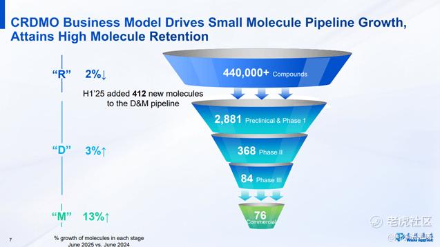 以药明康德极具代表性的小分子管线为例:2024下半年到2025上半年的12个月里,其小分子业务在R端共交付超过44万个化合物;D端(临床前-临床3期)管线中共3333个分子,同比增长3%;M端共76个分子处于商业化生产阶段,同比增长13%。合作规模在临床后期和商业化阶段持续扩大,3期及以上小分子项目数从2022年的107个增加至2025年上半年的160个。