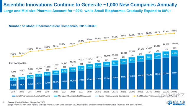 创新源头的多样化也正在加快。每年约有1000家生物科技初创公司成立,在产业前沿探索中扮演着重要角色。中小型公司的研发投入增速高于大型药企,且对外部研发服务的依赖度更高,成为药明康德的重要“长尾客户”。