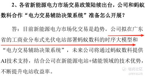 目前新能源电力市场化交易是趋势。能辉科技拟在广东省的工商业分布式光伏电站部署蚂蚁数科的时序大模型和“电力交易辅助决策系统”,未来公司将通过蚂蚁数科提供AI技术支持,结合公司在新能源电站+储能领域的技术优势,不断提升电站收益率。