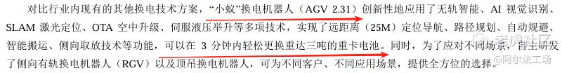 对比行业内现有的其他换电技术方案,“小蚁”换电机器人创新性地应用了无轨智能、AI视觉识别、SLAM激光定位、OTA空中升级、伺服液压举升等多项技术,实现了远距离(25M)定位导航、路径规划、自动规避、智能搬运、侧向取放技术等功能,可以在3分钟内轻松更换重达3吨的重卡电池。
