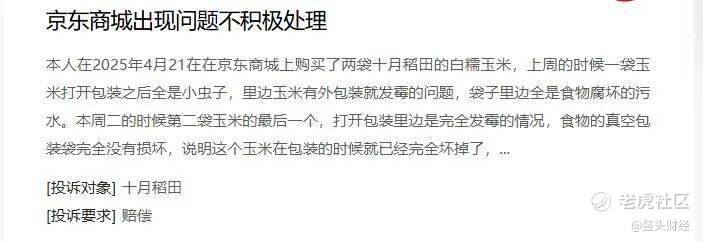 还有一位消费者投诉称,2025年8月2日在抖音商城十月稻田旗舰店购买2袋玉米,打开后发现玉米已经发霉变质。