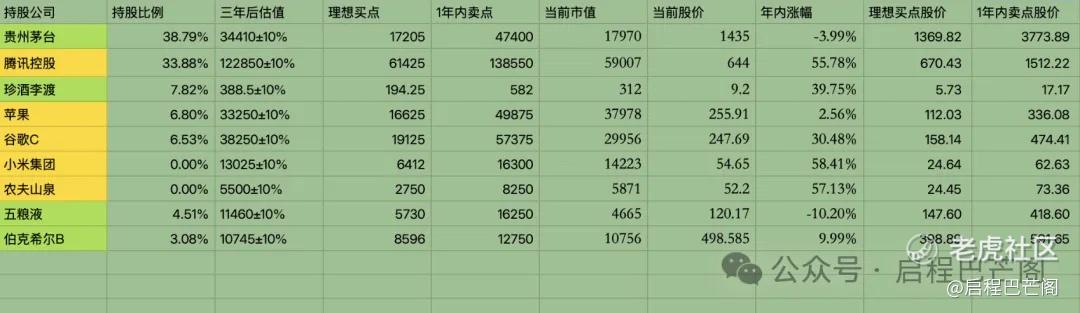 目前十大持仓:贵州茅台39%,腾讯34%,珍酒李渡7%,苹果7%,谷歌6%,五粮液4%,伯克希尔3%。目前九大持仓占比88%(其中科技股占比47%,白酒股占比50%;A股占比43%,港股占比41%,美股占比16%),还有12%观察仓和现金。