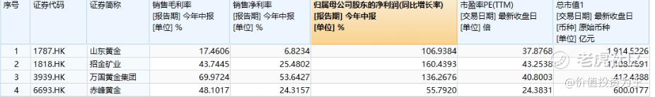从业务上看,山东黄金有大量的低毛利贸易业务,导致整体盈利能力偏弱,招金矿业跟紫金黄金国际极为相似,上半年的净利润增速高达160%,也与紫金黄金国际143%的增速相近,有很强的可比性。