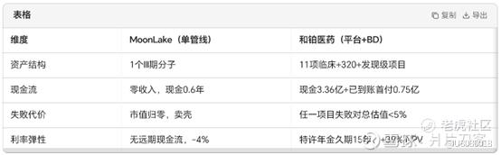 和铂医药-B(02142.HK)报14.52港元,市值126.6亿港元(≈16亿美元);账上现金3.36亿美元(≈26亿港元),零负债,年化运营支出0.32亿美元,现金覆盖期≥10年。$MoonLake(MLTX)$ VS$和铂医药-B(02142)$