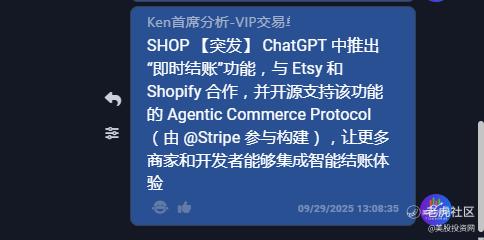 Etsy与Shopify短期催化剂: $Etsy, Inc.(ETSY)$ 收盘大涨近16%, $Shopify Inc(SHOP)$ 上涨超6%。 市场将此视为重大利好,因为它们是OpenAI首批集成的伙伴。Shopify平台的100多万商家(包括Glossier, Skims等品牌)接入即时结账功能后,等于获得了直接连接ChatGPT 7亿周用户的新流量入口和转化渠道,极大简化了购物流程,提升了转化率。