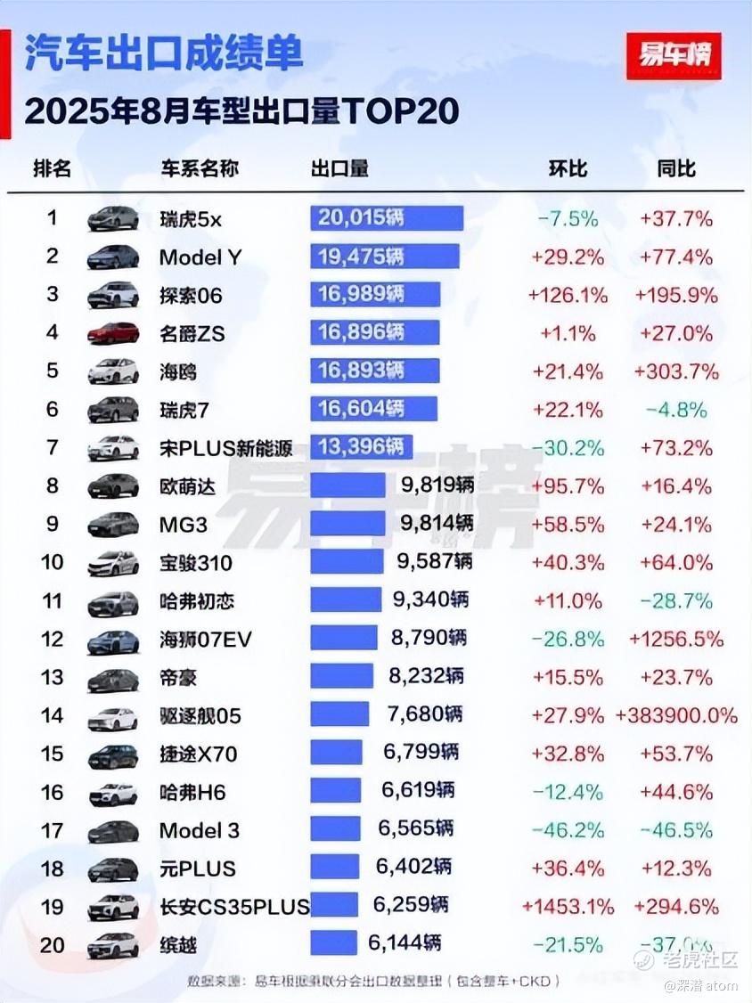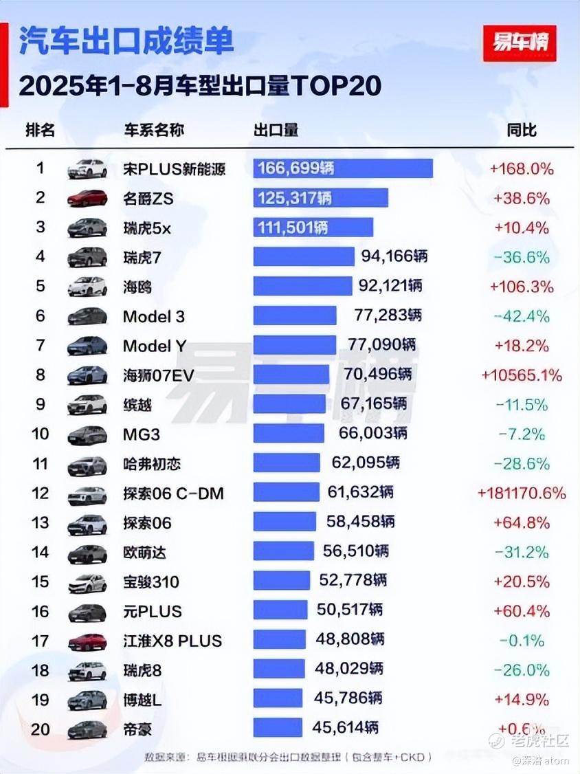 图4:1-8月车型出口排行榜,比亚迪宋Plus新能源独占鳌头