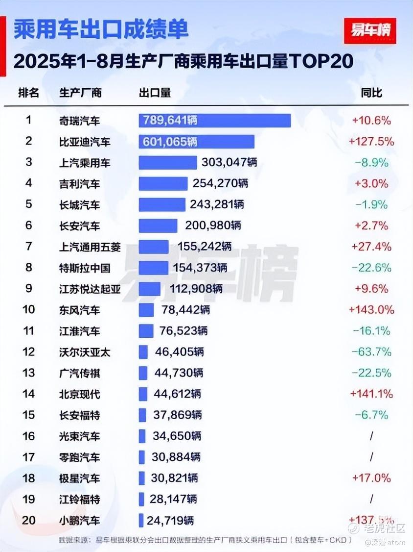 根据权威汽车媒体易车整理的出口数据:8月,比亚迪在生产厂商乘用车出口量排名中以79603辆的成绩位列第二,同比增长154.5%,增速排名第一。此外,8月共有五款车型跻身出口销量榜前二十名,今年1-8月,比亚迪汽车累计出口量达601065辆,其中明星车型宋PLUS新能源销量达166699辆,摘得车型出口榜冠军。