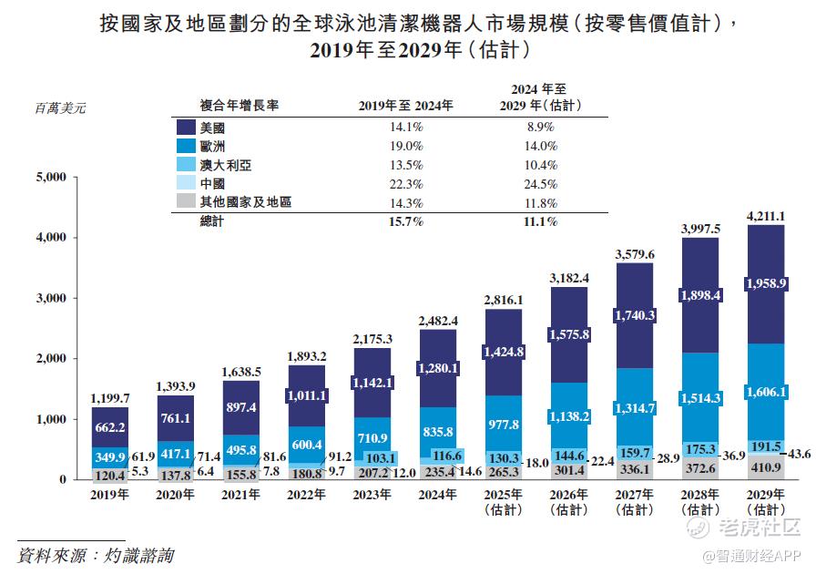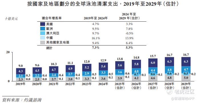 受益于全球城市化加快,以及住宅建筑、酒店、学校及其他商业场所数量增加所带动,近年来全球泳池数量持续增长。数据显示,截至去年底全球泳池总数约为3290万个,预计到2029年将增加至3930万个,对应年复合增长率为3.6%。泳池文化持续渗透进普罗大众日常生活中,这也使得相应的泳池清洁支出水涨船高。2024年,全球泳池清洁支出约为129亿美元,预计至2029年将进一步增加至167亿美元,对应期间复合年增长率为5.3%。