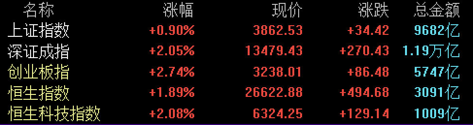 8天长假前的倒数第二个交易日,A股港股迎来普涨,午后加速上涨,上证收3862点,距前高3899仅差不到1%,深成指和创业板指本均涨超2%,实现了对周五阴线的反包,盘面上颇为强势。
