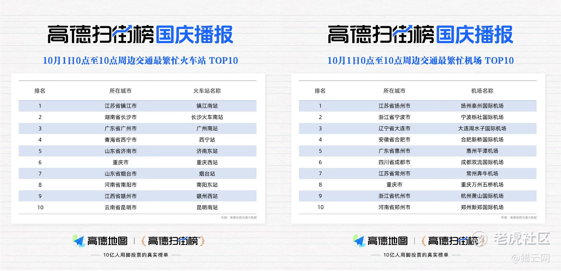 公共交通出行方面,高德交通大数据提示,10月1日上午,镇江南站、长沙火车南站、广州南站、西宁站、济南东站等周边交通繁忙;扬州泰州国际机场、宁波栎社国际机场、大连周水子国际机场、合肥新桥国际机场、惠州平潭机场等周边交通繁忙,建议使用高德地图“未来用时”功能提前规划出行路线。