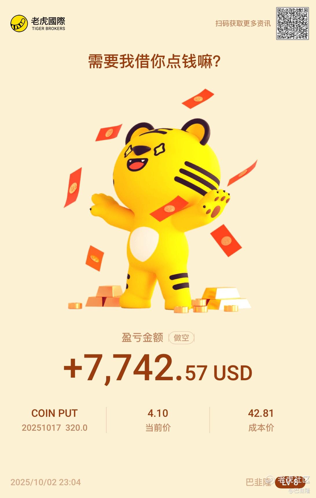 $COIN 20251017 320.0 PUT$ 滚仓熬出头,18块的时间价值还差3块,这两天看看要不要再滚仓到月底。如果320以下要接盘,能接受。270位置还有put。但没大事件很难接到。