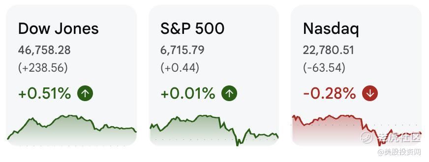 最终收盘,道指收涨0.51%,报46758.28点,连续第四日创收盘历史新高,本周累计上涨1.10%。标普500指数收涨0.01%,报6715.79点,连续第三日收创新高,本周累计上涨1.09%。纳指未能延续涨势,收跌0.28%,报22780.506点,结束了其强势上涨势头,不过本周仍累计上涨1.32%。