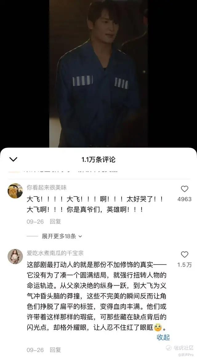 尤其是大飞为了兄弟陆冰河的幸福而选择牺牲自己的情节,成为该剧中的一大泪点。当集评论数高达1万余条,一条点赞数高达1.5万的评论提到:「从父亲决绝的纵身一跃,到大飞为义气冲昏头脑的莽撞,这些不完美的瞬间反而让角色们挣脱了扁平的标签,变得血肉丰满。他们或许带着这样那样的瑕疵,可那些藏在缺点背后的闪光点,却格外耀眼,让人忍不住红了眼眶。」