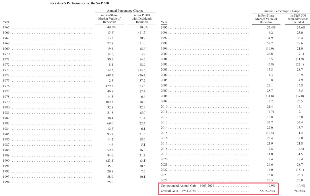 各位可以打开手机计算器算一下,1.2乘1.2乘1.2乘1.2,1.2连乘4次,也就是1.2的4次方,就有2.0736了,意味着保持20%的年化收益率,不到4年(实际算下来是3.6年)的时间资产就可以翻一倍。3.6年资产翻一番,从2倍变4倍,再过一个3.6年,就是从4倍变8倍,然后8倍变16倍,16倍变32倍......巴菲特从1965~2024这60年时间里翻了恐怖的5.5万倍!什么概念?如果拥有20%的年化收益率,一个人最初的本金如果是10万元,60年后他的资产将达到55亿元。