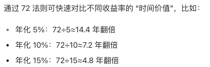 看到这,你还会觉得20%的收益率少吗?也有人会说,20%的年化收益率普通人太难实现了。的确,长期保持年化20%的收益率难度不小,那年化15%?年化10%呢?对于普通散户来说,还是有很大可能实现的。年化15%,大约5年翻一倍;年化10%,大约7.3年翻一倍,时间如果足够长,总收益也会非常丰厚。有个72法则,可以快速估算出几年翻一倍,感兴趣的可以看一看。