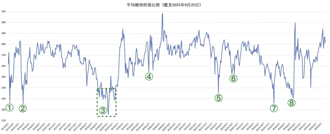 A股方面,更大的冲击出现在四月下旬,受上海封控的影响,上证指数跌至2863点,平均维持担保比例在2019年1月之后首次跌破240%。点击回顾→2022年4月25日 失守3000点
