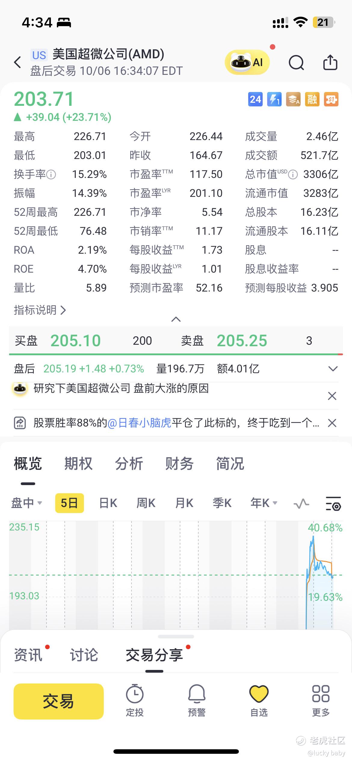事件二:amd因为跟openai达成合作然后一日高峰暴涨40%回到20%,164到205也是一下子的事情,所以一定要注重仓位管理,并且不要追涨杀跌,对于期权要有敬畏之心。还有及时盈利将盈利部分套现, 不然最后可能归零$美国超微公司(AMD)$
