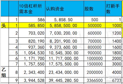 甲尾47万本金,乙头需要认购资金586万,乙组的各档融资所需要的本金还有融资金额对应如下表: